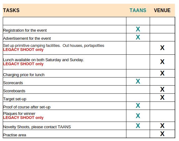 Submit a venue for a TAANS event Submit a venue TAANS Legacy shoot is a fixed date each year on the second full weekend in July.The TAANS Frolic shoot dates are now available and can be selected by choosing ‘TAANS Frolic’ in the submission form Full Name *Email Address *Phone *Name of the group or club if applicableUpload file for the club or group logo if applicableChoose FileNo file chosenDelete uploaded fileVENUE Address *CityPostal CodeI/We would like to submit a venue for the: *TAANS Legacy shootTAANS FrolicTAANS LEGACY SHOOT - JULY 12/13, 2025Legacy Shoot - July 12/13, 2025Facilities *Porta Potti or Toilette on sideSpace for Tents availableSpace for RV/Trailer availableBBQ on sitePractise area availableCheck all that applyShooting course *The venue is providing all 20 targetsThe venue has an amount of 1 to 10 targetsThe venue has no targets. Please contact us.MIlk Jug novelty shootOther novelty shootWhat food will be available during the event and for how much? *Message you would like to shareTAANS FrolicTAANS FrolicFood provided *YesNO - Bring your own lunchIf food provided please let us know what food and how much for the particpantShoot days *One day shootTwo day shootAvailable dates for the TAANS FrolicAugust 2/3August 16August 30September 6/7September 20September 27/28October 11/12October 18/19October 25/26Please check the dates for the Frolic.Please tell us about the Frolic. What is planned to do? Family Event, shoot (how many rounds) or... *How many targets can the venue provide?Anything you would like to share? Send Message